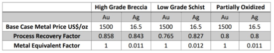 The PEA is preliminary in nature, and it includes inferred mineral resources that are considered too speculative geologically to have the economic considerations applied to them that would enable them to be characterized as mineral reserves, and there is no certainty that the PEA will be realised. A gold price of US$1500/oz and a silver price of US$16.5/oz were used for estimations of metal equivalents. Metal equivalent factors were calculated separately for the three main material types of the mineral resource as shown below: